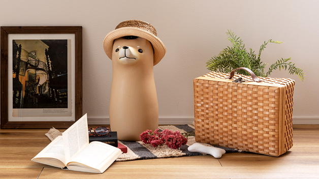 この柴犬傘立ては、インテリアとしてこんな飾り方もおすすめです。帽子の収納として被せてあげるとなんともかわいらしく、実用的に使えます。