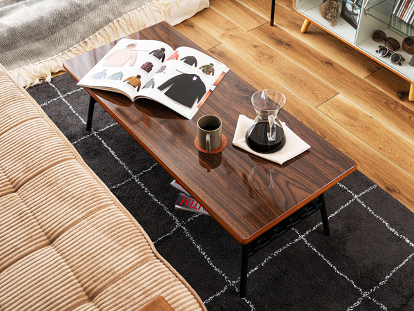 鏡面仕上げのセンターテーブルはお部屋を洗練された雰囲気へ導きます。さらに、機能面では折りたたみできることに加え、収納棚付きという実用性も兼ね備えています。