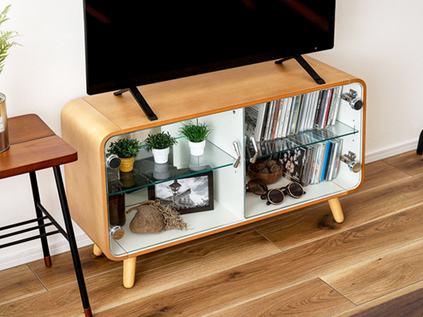 背面ミラー付きのコレクションシェルフは、お気に入りのアイテムをほこりや光から守りつつ、美しく飾ることができます。また、テレビ台としても活用できるため、スペースを有効に活用できるのが魅力です。
