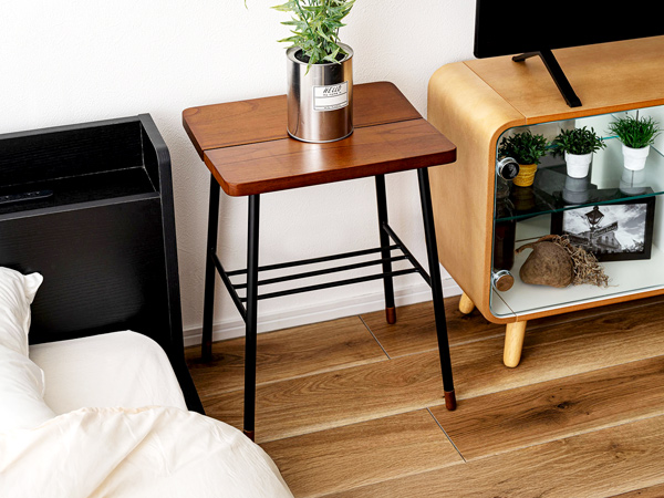 こちらのスツールはサイドテーブルとしても丁度いいサイズ感。天然木ミンディの深みのある色合いとスチール素材の組み合わせが洗練された雰囲気をお部屋にもたらします。