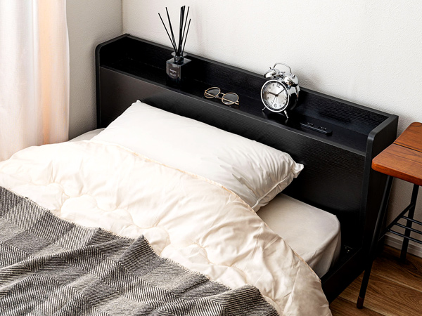 ロースタイルのベッドはお部屋を広く見せる作用があるのでワンルームにおすすめ。ヘッドボードには2口コンセント付きで就寝前のスマホ充電のスペースとして活躍します。
