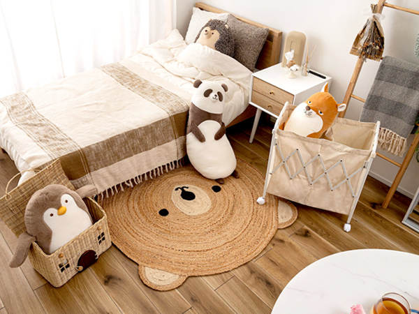 ナチュラルカラーで自然とお部屋に馴染んでくれるアニマルぬいぐるみたちをほっこりアイテムとしてお部屋に招き入れてみましょう。ジュートラグもくまさんデザインで一体感を生み出します。