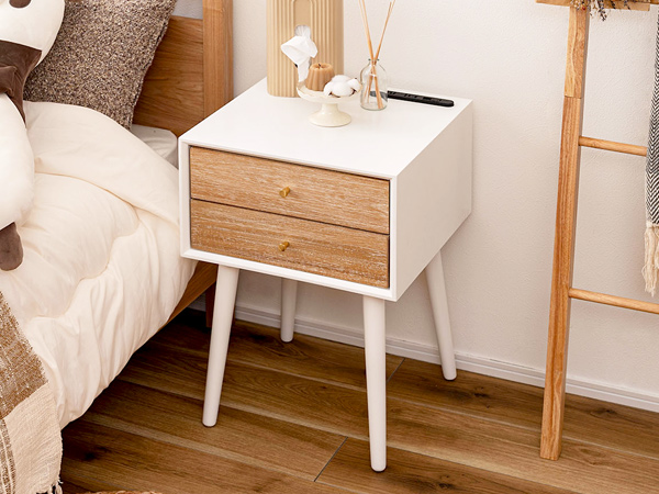 USBポートとコンセントがついたサイドテーブルはベッド横で大活躍。寝る前に灯りをともして本を読んだり、スマホを充電したり、ちょっとしたものを手の届くところに置けるだけで、ぐっと快適な空間に。
