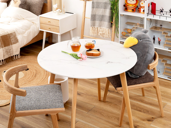 円形のダイニングテーブルは、柔らかい空間にぴったり。さらに、天然木のダイニングチェアはテーブルに引っ掛けられるので、お掃除ロボットが自由に活躍できるのも大きなメリットです。