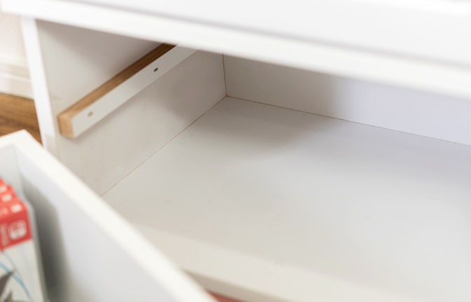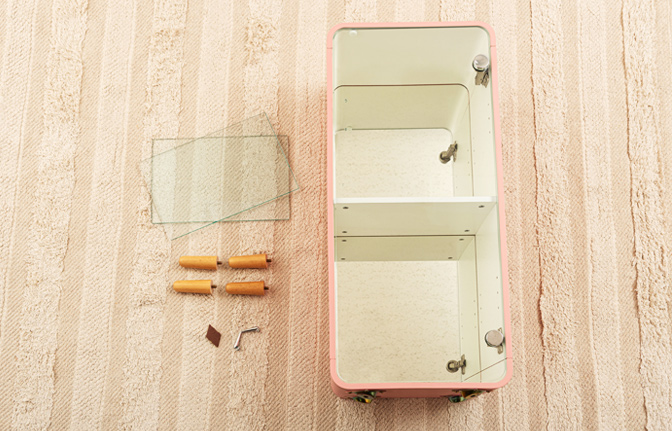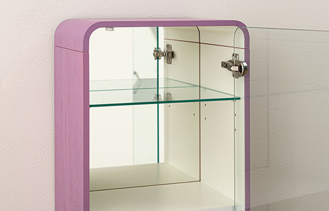 まさかこの中に隠し収納があるとは思わせないナチュラルでシンプルなデザインのコレクションシェルフ。表には見せたいグッズを並べて、側面裏側の扉の中には人には見せづらい本などを入れることができます。