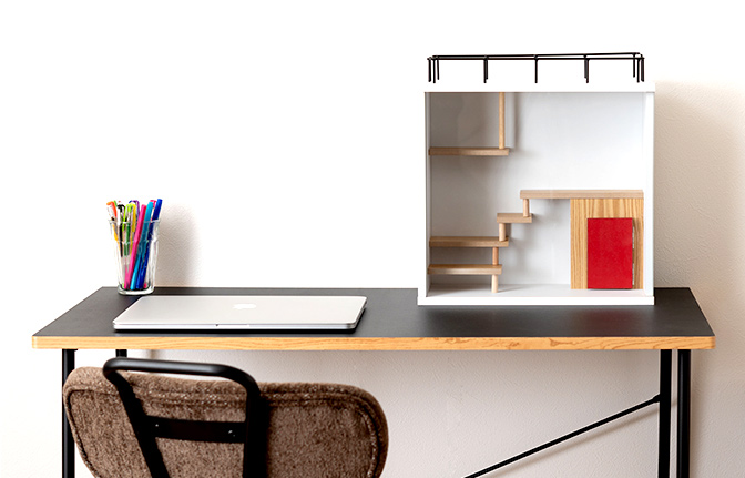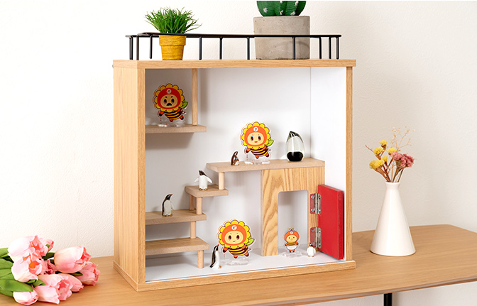 一見すると普通のカラーボックスのようですが…中を覗くとお家みたいな空間が広がっていて、誰かが住むための空き物件のようです。階段や個室つきで、リアルなミニチュアのお部屋を作ることができます。壁掛けも可能。