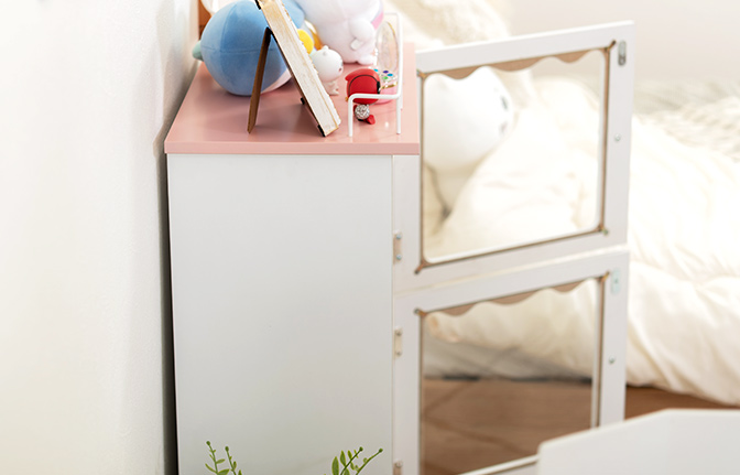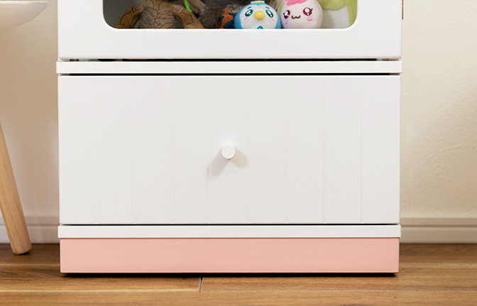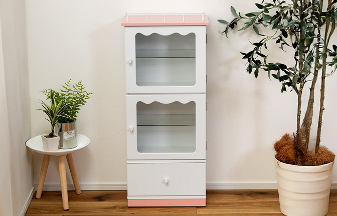 ぬいぐるみをかわいく飾る為に設計・デザインされたこちらのぬいぐるみマンションは、可愛い窓枠のような扉の上部のデザインが印象的です。デザインのみならず、キャスター付きで移動もスムーズです。ぬいぐるみを埃や光から守りながらディスプレイできるのが魅力です。